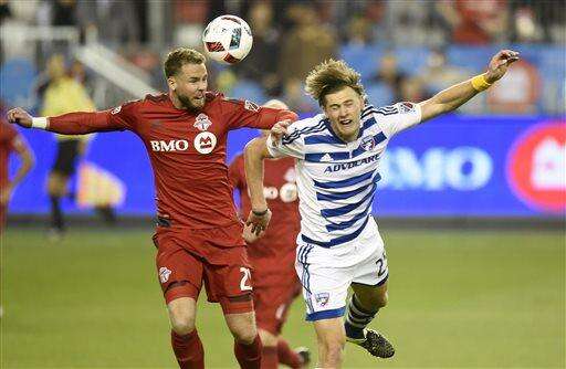 FC Dallas' Walker Zimmerman and Toronto FC's Jonathan Osorio, left, battle for the ball during the second half of an MLS soccer match in Toronto on Saturday, May 7, 2016. (Frank Gunn/The Canadian Press via AP) MANDATORY CREDIT The Associated Press