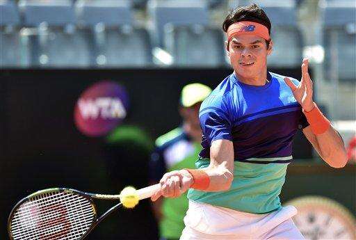 Milos Raonic of Canada returns the ball to Marco Cecchinato of Italy during their match at the Italian Open tennis tournament, in Rome, Monday, May 9, 2016. (Ettore Ferrari/ANSA via AP Photo) ITALY OUT
