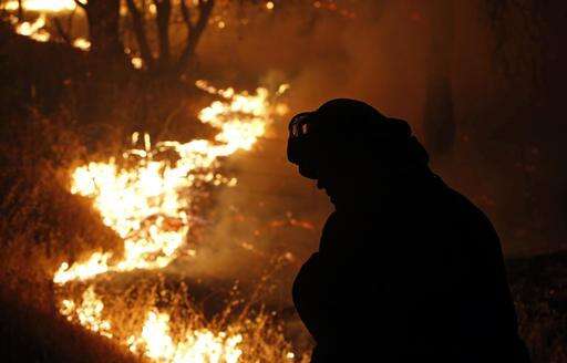 FILE - In this Sept. 11, 2015, file photo, a firefighter turns his head from flames of the Butte Fire burning near San Andreas, Calif. A dry and blistering hot northern Alberta is burning and doing so unusually early in the year, but that’s only the latest of many gargantuan fires on an Earth that’s grown hotter with more extreme weather. (AP Photo/Rich Pedroncelli, File) The Associated Press