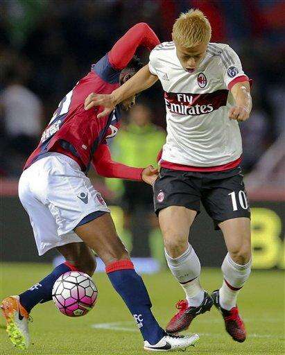 Bologna FC's Amadou Diawara of Guinea, left, and AC Milan's Keisuke Honda of Japan challenges for a ball during the Italian Serie A soccer match between Bologna FC and AC Milan at the Dall'Ara Stadium in Bologna, Italy, Saturday, May 7, 2016. (Giorgio Benvenuti/ANSA via AP) ITALY OUT The Associated Press