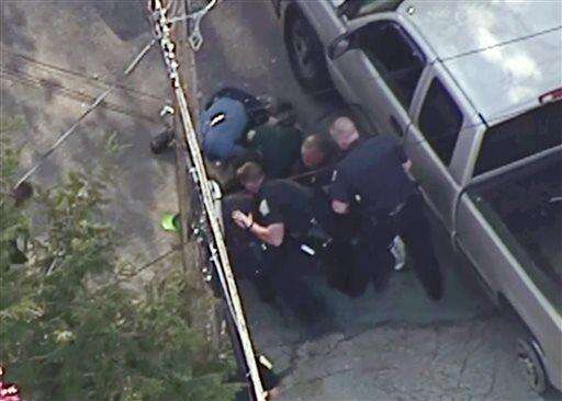 This aerial image made from a helicopter video provided by WHDH shows several officers pummeling Richard Simone, who had exited his vehicle and kneeled on the ground after a high-speed police pursuit, in Nashua, N.H., Wednesday, May 11, 2016. The chase went through several towns before ending in Nashua. (Courtesy WHDH via AP) MANDATORY CREDIT; BOSTON OUT The Associated Press