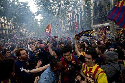 FC Barcelona supporters celebrate their team's victory in the Spanish league title at Canaletas source at Las Ramblas, in Barcelona, Spain, Saturday, May 14, 2016. (AP Photo/Emilio Morenatti) The Associated Press