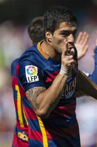 Suarez opened the scoring from close range in the 22nd minute after a pass by Jordi Alba, added to the lead with a header in the 38th off a cross by Dani Alves, and netted his third after a set up by Neymar inside the area in the 86th.