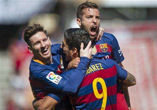 FC Barcelona's Luis Alberto Suarez from Uruguay, center, celebrates scoring against Granada with teammates Lionel Messi from Argentina, left, and Jordi Alba during a Spanish La Liga soccer match between Granada and Barcelona at Los Carmenes stadium in Granada, Spain, Saturday, May 14, 2016. (AP Photo/Daniel Tejedor) The Associated Press