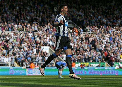 Newcastle United's Georginio Wijnaldum, right, celebrates scoring his side's first goal of the game during the English Premier League soccer match between Newcastle United and Tottenham Hotspur at St James' Park stadium in Newcastle, England. Sunday May 15, 2016. (Owen Humphreys/PA via AP) UNITED KINGDOM OUT - NO SALES - NO ARCHIVE