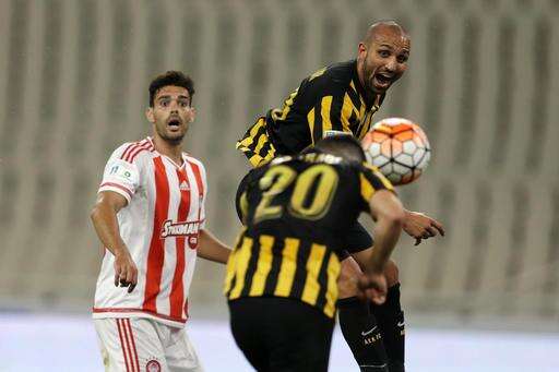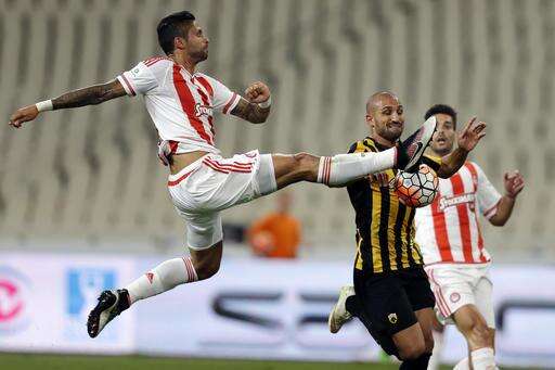 Olympiakos' Manuel Da Costa, left, tries to stop the ball reaching AEK Athens' Rafik Djebbour during the Greek Final Cup at the Olympic Stadium of Athens, on Tuesday, May 17, 2016. The match was played without fans and following repeated delays due to a spat between the government and country's football association that saw Greece run the risk of international sanctions from FIFA. (AP Photo/Thanassis Stavrakis) The Associated Press