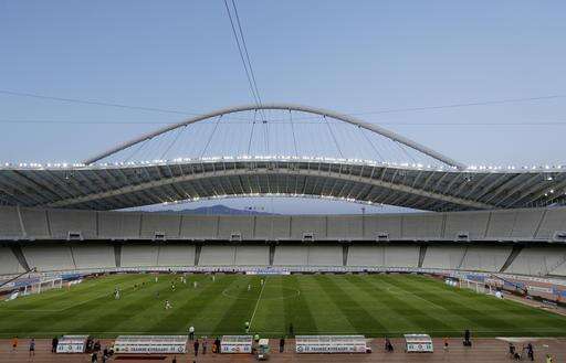 Players from Greek champion Olympiakos, red, and AEK Athens during the Greek Final Cup at the 69,000-seat Olympic Stadium of Athens, on Tuesday, May 17, 2016. The match was played without fans and following repeated delays due to a spat between the government and country's football association that saw Greece run the risk of international sanctions from FIFA. (AP Photo/Thanassis Stavrakis) The Associated Press