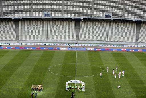 Players from AEK Athens, left, pose for a team photo as Greek champion Olympiakos wait for the start of the Greek Final Cup at the 69,000-seat Olympic Stadium of Athens, on Tuesday, May 17, 2016. The match was played without fans and following repeated delays due to a spat between the government and country's football association that saw Greece run the risk of international sanctions from FIFA. (AP Photo/Thanassis Stavrakis) The Associated Press