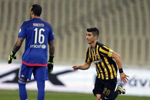 Olympiakos' goalkeeper Roberto, left, looks up after AEK Athens' Petros Mantalos celebrates scoring the opening goal during the Greek Final Cup at the Olympic Stadium of Athens, on Tuesday, May 17, 2016. (AP Photo/Thanassis Stavrakis) The Associated Press