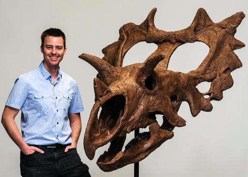 In this April 29, 2016 photo provided by the Canadian Museum of Nature, Canadian Museum of Nature paleontologist Dr. Jordan Mallon poses for a photo with a reconstruction of the skull of Spiclypeus shipporum nicknamed Judith, at the museum in Ottawa, Canada. A novice fossil collector's find in a remote Montana badlands more than a decade ago has emerged as a new kind of spectacularly-horned dinosaur. Researchers at the Canadian Museum of Nature announced Wednesday, May 18, that they've validated the bones found near Winifred, Montana as a new species that lived roughly 76 million years ago. (Martin Lipman/Canadian Museum of Nature via AP) The Associated Press
