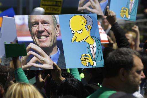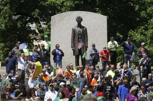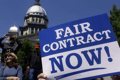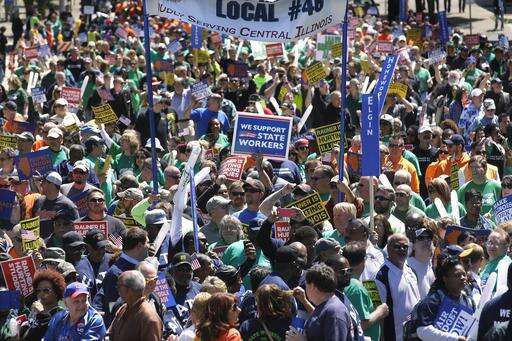Union supporters rally against Republican Illinois Gov. Bruce Rauner's calls to change collective bargaining policies, in front of the Illinois State Capitol Wednesday, May 18, 2016, in Springfield, Ill. The march is organized by a coalition of labor groups called Illinois Working Together. (AP Photo/Seth Perlman) The Associated Press