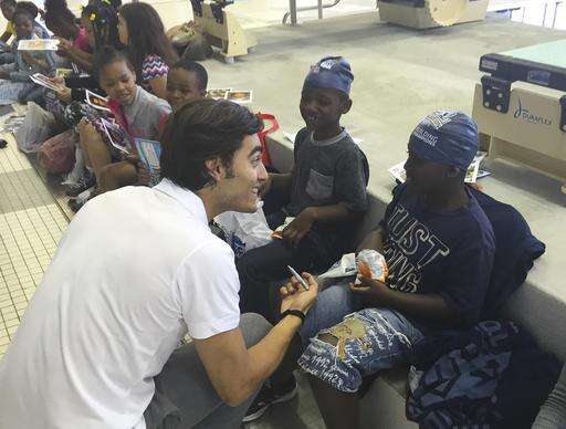 In this photo taken Friday, April 29, 2016, Disney Channel star Blake Michael signs autographs after taking part in a "Make A Splash" swimming clinic at the Georgia Tech aquatic center in Atlanta. USA Swimming hopes celebrities will help spread the message that all kids need to learn how to swim. (AP photo/Paul Newberry) The Associated Press
