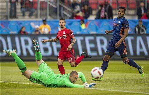 Toronto FC Sebastian Giovinco, center, shoots the ball as New York City FC goalkeeper Josh Saunders makes a save as Ethan White, right, follows the play during the first half of an MLS soccer game against New York City FC on Wednesday, May 18, 2016, in Toronto. (Mark Blinch/The Canadian Press via AP) The Associated Press