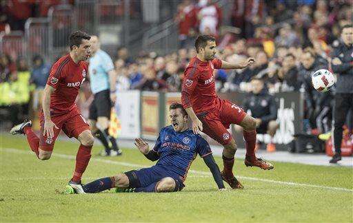 Toronto FC Steven Beitashour, right, battles for the ball with teammate Daniel Lovitz, left, against New York City FC Patrick Mullins during the second half of an MLS soccer game against New York City FC on Wednesday, May 18, 2016, in Toronto. (Mark Blinch/The Canadian Press via AP) The Associated Press
