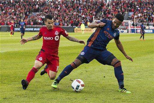 Toronto FC's Sebastian Giovinco, left, battles for the ball with New York City FC's Ethan White during the first half of an MLS soccer game against New York City FC on Wednesday, May 18, 2016, in Toronto. (Mark Blinch/The Canadian Press via AP) The Associated Press