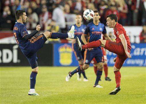 Toronto FC's Daniel Lovitz, right, battles for the ball with New York City FC's David Villa during the second half of an MLS soccer game against New York City FC on Wednesday, May 18, 2016, in Toronto. (Mark Blinch/The Canadian Press via AP) The Associated Press