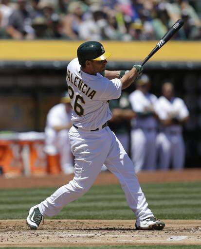 Oakland Athletics' Danny Valencia swings for a two run single off Texas Rangers' Martin Perez in the first inning of a baseball game Wednesday, May 18, 2016, in Oakland, Calif. (AP Photo/Ben Margot) The Associated Press