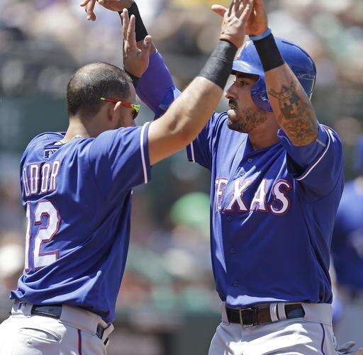 Texas Rangers' Ian Desmond, right, is congratulated by Rougned Odor (12) after scoring against the Oakland Athletics in the sixth inning of a baseball game, Wednesday, May 18, 2016, in Oakland, Calif. Desmond scored on a single by Rangers' Prince Fielder. (AP Photo/Ben Margot) The Associated Press