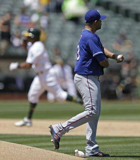 Texas Rangers pitcher Martin Perez, right, walks off the mound as he waits for Oakland Athletics' Khris Davis, left, to run the bases after hitting a home run in the sixth inning of a baseball game, Wednesday, May 18, 2016, in Oakland, Calif. (AP Photo/Ben Margot) The Associated Press