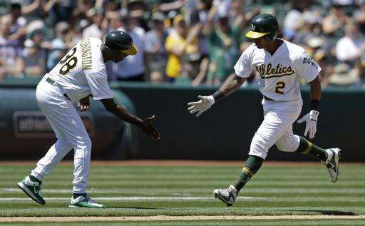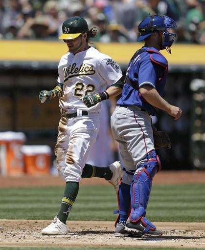 Oakland Athletics' Josh Reddick, left, scores behind Texas Rangers catcher Bryan Holaday in the first inning of a baseball game Wednesday, May 18, 2016, in Oakland, Calif. Reddick scored on single by A's Danny Valencia. (AP Photo/Ben Margot) The Associated Press