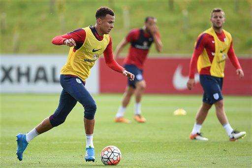 England's Dele Alli runs with the ball during the training session at St George's Park, Burton, England, on Wednesday, May 18, 2016. England will play an international soccer friendly against Turkey on Sunday, May 22. (Joe Giddens/PA via AP) UNITED KINGDOM OUT - NO SALES - NO ARCHIVES