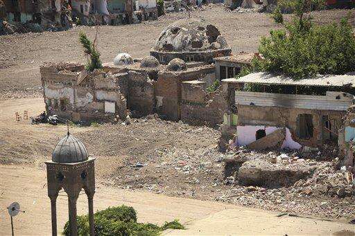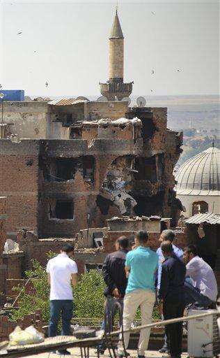 A view of damage including a mosque on parts of the historic district of the mainly Kurdish city of Diyarbakir, southeastern Turkey, Sunday, May 22, 2016. Turkish authorities have lifted a long-standing curfew from parts of the historic district famed for its ancient city walls listed as a UNESCO World Heritage site, following its security operations to flush out youths and fighters linked to a Kurdish armed movement, that have been underway in parts of the city since December.(AP Photo/Mahmut Bozarslan)