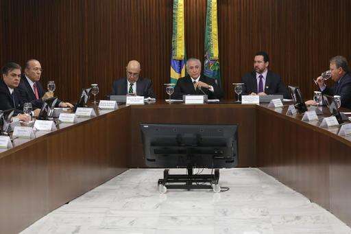 Brazil's acting President Michel Temer, center, holds a meeting on economic measures with party leaders from the Lower House and Senate at Planalto presidential palace in Brasilia, Tuesday, May 24, 2016. Temer announced belt-tightening measures aimed at pulling Latin America’s largest economy from its worst crisis in decades, including taking back billions it loaned Brazil’s state-run investment bank, abolishing a fund created to channel oil revenues into education, sharply cutting public spending and negotiating reforms to the country’s pension system. Temer took over after President Dilma Rousseff was impeached earlier this month for allegedly using accounting tricks in managing the federal budget. (AP Photo/Eraldo Peres) The Associated Press