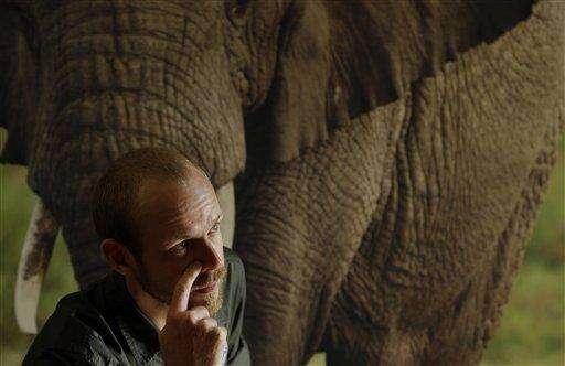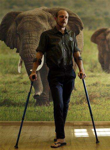 In this photo taken Monday, May 23, 2016, Erik Mararv, the manager of the Garamba National Park in Congo, is photographed against a poster backdrop of elephants during an interview with The Associated Press in Johannesburg, while recuperating from his injuries. . Mararv described a firefight with elephant poachers in which he was wounded and three rangers were killed last month in Garamba which is vulnerable to attacks from a variety of armed groups that kill elephants for their ivory and operate across national borders. (AP Photo/Themba Hadebe) The Associated Press