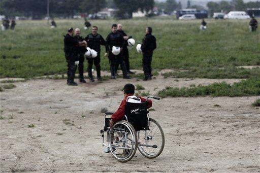 A child uses a wheelchair near policemen during a police operation at a makeshift refugee camp at the Greek-Macedonian border near the northern Greek village of Idomeni, Tuesday, May 24, 2016. Greek authorities began an operation at dawn Tuesday to gradually evacuate the country's largest informal refugee camp of Idomeni on the Macedonian border, blocking access to the area and sending in more than 400 riot police. (Yannis Kolesidis/ANA-MPA via AP)