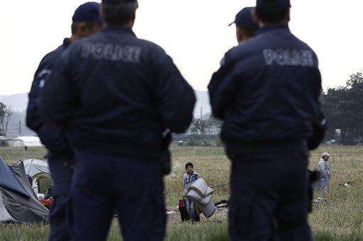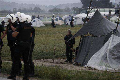 Policemen stand next to tents during a police operation at a makeshift refugee camp at the Greek-Macedonian border near the northern Greek village of Idomeni, Tuesday, May 24, 2016. Greek authorities began an operation at dawn Tuesday to gradually evacuate the country's largest informal refugee camp of Idomeni on the Macedonian border, blocking access to the area and sending in more than 400 riot police. (Yannis Kolesidis/ANA-MPA via AP)