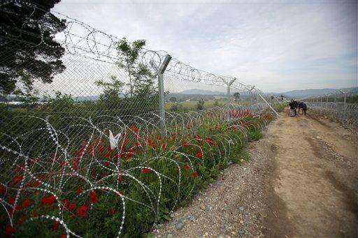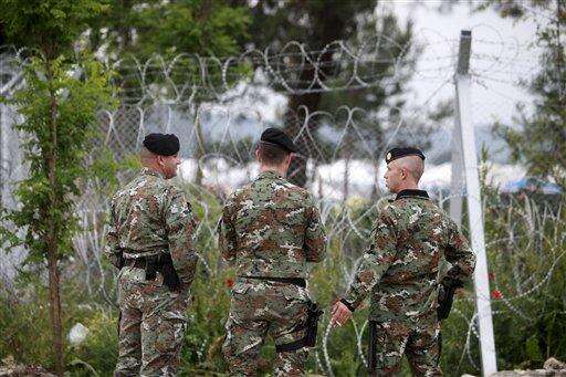 Macedonian soldiers watch the evacuation of a makeshift refugee camp by the Greek authorities at the Greek-Macedonian border near the northern Greek village of Idomeni, Tuesday, May 24, 2016. Greek authorities have begun an operation to gradually evacuate the country's largest informal refugee camp of Idomeni, on the Greek-Macedonian border, where more than an estimated 8,400 people have been living for months. (AP Photo/Boris Grdanoski)