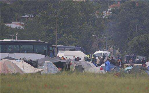 A bus with migrants leave from a makeshift refugee camp at the Greek-Macedonian border near the northern Greek village of Idomeni, Tuesday, May 24, 2016. Greek authorities have begun an operation to gradually evacuate the country's largest informal refugee camp of Idomeni, on the Greek-Macedonian border, where more than an estimated 8,400 people have been living for months. (AP Photo/Boris Grdanoski)