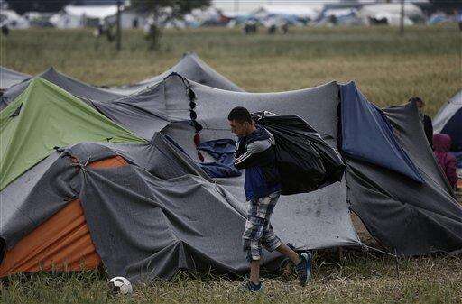 Migrants prepare their belongings as they leave from a makeshift refugee camp at the Greek-Macedonian border near the northern Greek village of Idomeni, Tuesday, May 24, 2016. Greek authorities have begun an operation to gradually evacuate the country's largest informal refugee camp of Idomeni, on the Greek-Macedonian border, where more than an estimated 8,400 people have been living for months. (AP Photo/Darko Bandic)