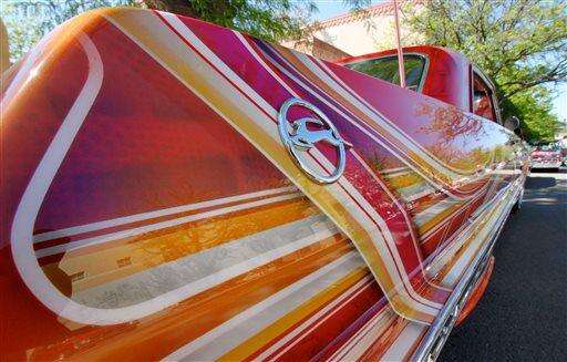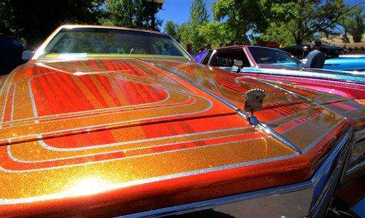 This May 22, 2016 photo shows a detailed lowrider paint job on display at the historic plaza in downtown Santa Fe, N.M., as part of the city's Lowrider Summer celebration, which includes a pair of exhibitions at the New Mexico History Museum and the New Mexico Museum of Art. (AP Photo/Susan Montoya Bryan) The Associated Press