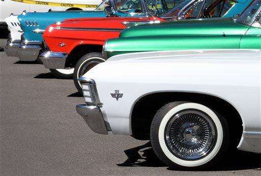 This May 22, 2016 photo shows lowriders on display at the historic plaza in downtown Santa Fe, N.M., as part of the city's Lowrider Summer celebration, which includes a pair of exhibitions at the New Mexico History Museum and the New Mexico Museum of Art. (AP Photo/Susan Montoya Bryan) The Associated Press