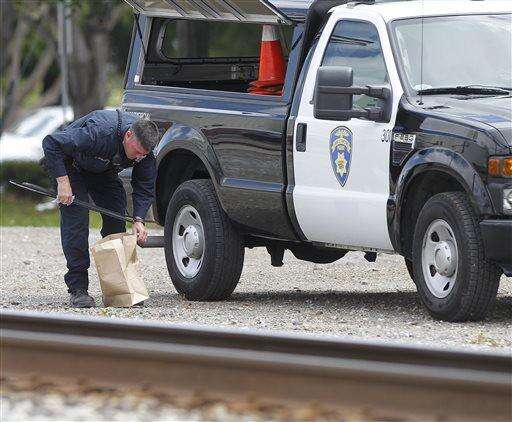 A San Leandro Police officer collects evidence near the scene after an Amtrak train collided with an SUV on Tuesday, May 24, 2016, in San Leandro, Calif. A mother and her child died in the crash according to authorities. (Aric Crabb/San Jose Mercury News via AP) MAGS OUT; NO SALES; MANDATORY CREDIT The Associated Press