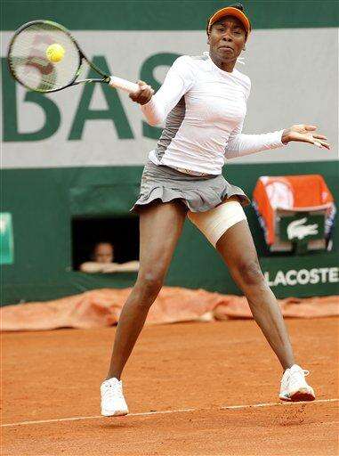 Venus Williams of the U.S. slams a forehand to Estonia's Anett Kontaveit during their first round match of the French Open tennis tournament at the Roland Garros stadium, Tuesday, May 24, 2016 in Paris. (AP Photo/Alastair Grant) The Associated Press