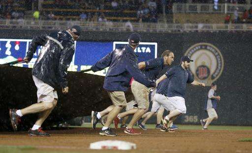 The Minnesota Twins ground crew pulls a tarp onto the field as a rain delay is called during the third inning of a baseball game against the Kansas City Royals in Minneapolis, Monday, May 23, 2016. (AP Photo/Ann Heisenfelt) The Associated Press