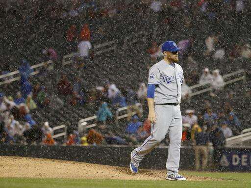 Kansas City Royals starting pitcher Ian Kennedy walks off the mound as a rain delay is called during the third inning of a baseball game against the Minnesota Twins in Minneapolis, Monday, May 23, 2016. (AP Photo/Ann Heisenfelt) The Associated Press