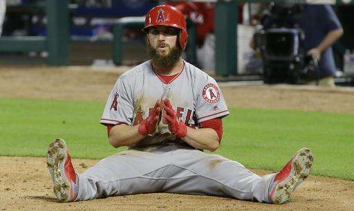 Los Angeles Angels Shane Robinson reacts after he was tagged out at home plate during the sixth inning of a baseball game against the Texas Rangers in Arlington, Texas, Tuesday, May 24, 2016. (AP Photo/LM Otero) The Associated Press