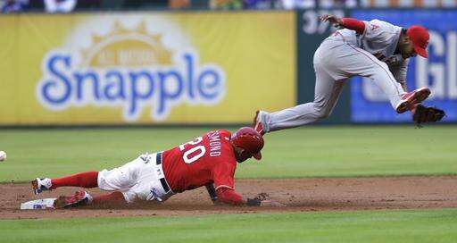 Texas Rangers' Ian Desmond (20) steals second base against Los Angeles Angels second baseman Gregorio Petit during the first inning of a baseball game in Arlington, Texas, Tuesday, May 24, 2016. (AP Photo/LM Otero) The Associated Press