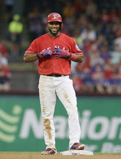 Texas Rangers' Elvis Andrus smiles while standing on second base after hitting an RBI double during the fourth inning of a baseball game against the Los Angeles Angels in Arlington, Texas, Tuesday, May 24, 2016. Rangers Nomar Mazara scored on the play. (AP Photo/LM Otero) The Associated Press