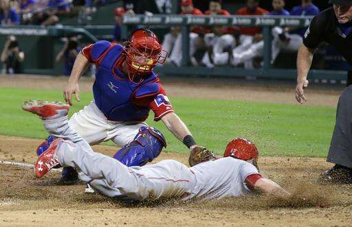 Los Angeles Angels' Shane Robinson, bottom, is tagged out at home by Texas Rangers catcher Bryan Holaday during the sixth inning of a baseball game in Arlington, Texas, Tuesday, May 24, 2016. (AP Photo/LM Otero) The Associated Press
