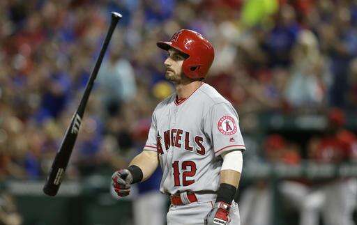Los Angeles Angels Johnny Giavotella tosses his bat after striking out with bases loaded against Texas Rangers starting pitcher Martin Perez during the sixth inning of a baseball game in Arlington, Texas, Tuesday, May 24, 2016. The Rangers won 4-1. (AP Photo/LM Otero) The Associated Press