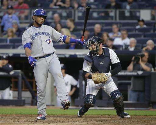 Toronto Blue Jays designated hitter Edwin Encarnacion reacts after striking out against the New York Yankees during the third inning of a baseball game, Tuesday, May 24, 2016, in New York. (AP Photo/Julie Jacobson) The Associated Press