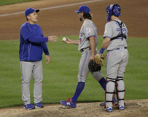 Toronto Blue Jays pitcher R.A. Dickey, center, is removed by manager John Gibbons as catcher Josh Thole watches during the seventh inning of a baseball game against the New York Yankees, Tuesday, May 24, 2016, in New York. (AP Photo/Julie Jacobson) The Associated Press
