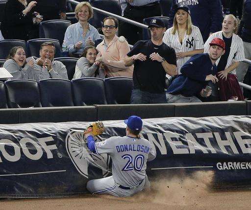 A foul ball hit by New York Yankees' Aaron Hicks drops into the stands as Toronto Blue Jays third baseman Josh Donaldson (20) slides against the tarp during the eighth inning of a baseball game, Tuesday, May 24, 2016, in New York. The Yankees won 6-0. (AP Photo/Julie Jacobson) The Associated Press