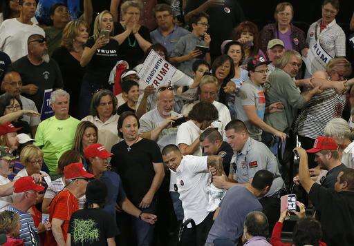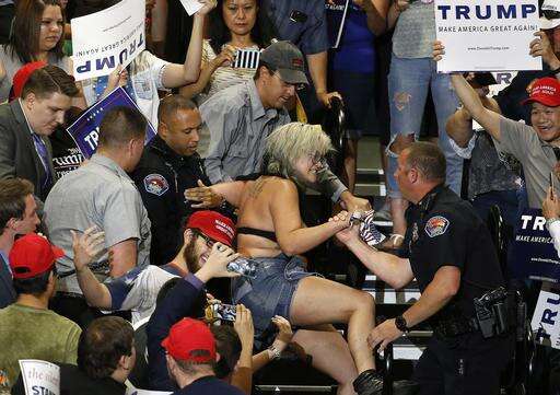 At one point, a female protester was physically dragged from the stands by security. Other protesters scuffled with security as they resisted removal from the convention center, which was packed with thousands of loud and cheering Trump supporters.