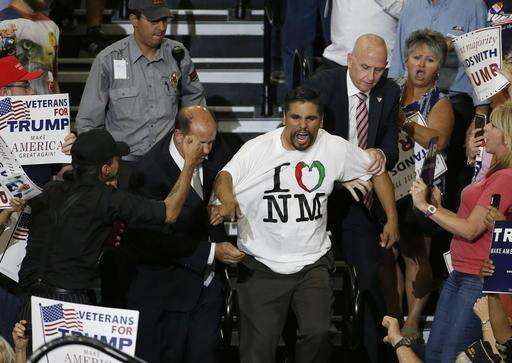 ALBUQUERQUE, N.M. (AP) - Protests outside a Donald Trump rally in New Mexico turned violent Tuesday night as demonstrators threw burning T-shirts, plastic bottles and other items at police officers, overturned trash cans and knocked down barricades.