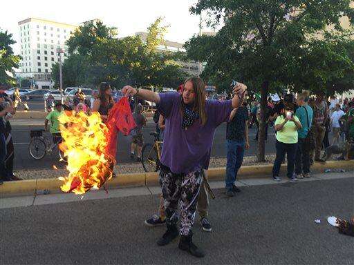During the rally, protesters outside overran barricades and clashed with police in riot gear. They also burned T-shirts and other items labeled with Trump's catchphrase, "Make America Great Again."